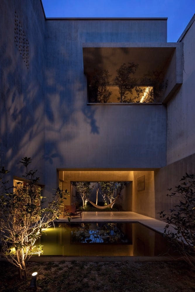 Hồ sen nhỏ bên võng cũng là sự tĩnh lặng, trầm mặc của công trình kiến trúc giữa sân vườn. Gia chủ ngồi trò chuyện, nằm đọc sách, mùi hương nhẹ nhàng trong không khí, hình bóng của tòa nhà, cây, lá, bầu trời và ánh trăng phản chiếu trên mặt hồ.