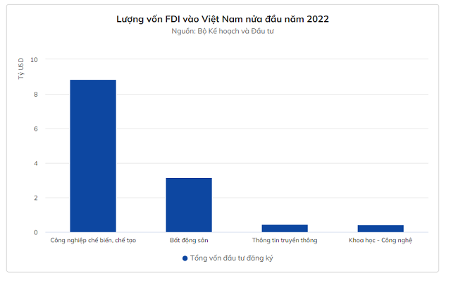 Theo số liệu mới nhất của Bộ Kế hoạch và Đầu tư, bất động sản là lĩnh vực đứng thứ 2 trong thu hút FDI, với hơn 3,15 tỷ USD, chiếm 22,5% tổng số vốn đăng ký trong nửa đầu năm nay.