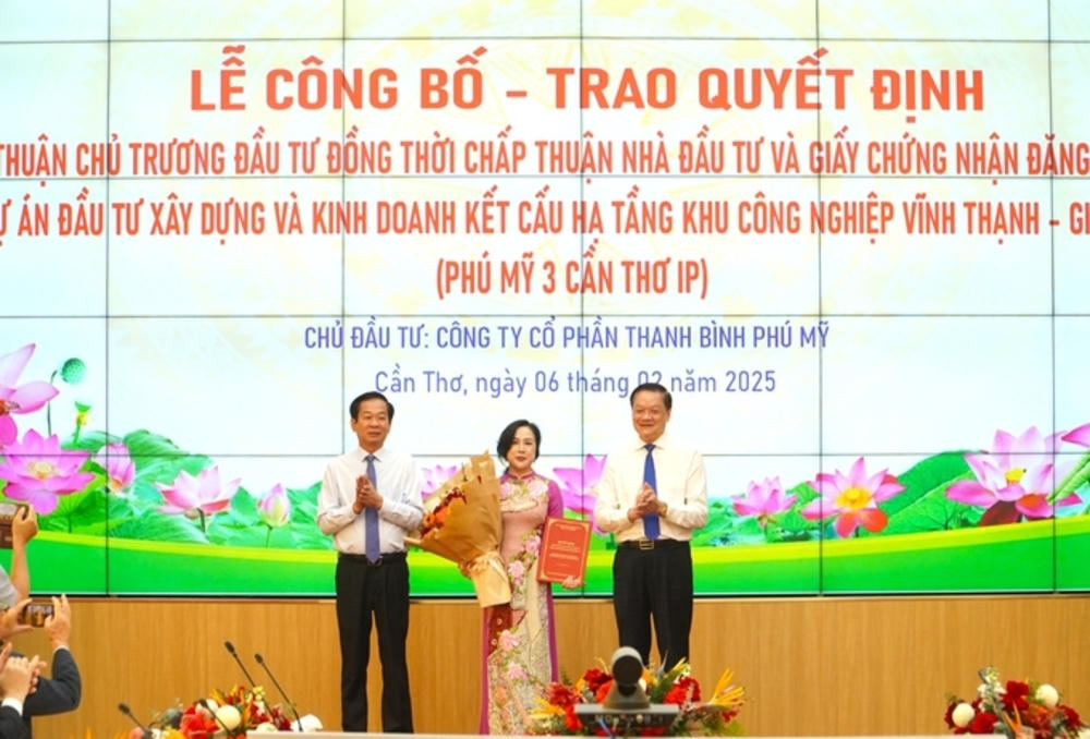 Ngày 6/2, UBND TP. Cần Thơ tổ chức công bố, trao quyết định chấp thuận chủ trương đầu tư, chấp thuận nhà đầu tư và giấy chứng nhận đăng ký đầu tư cho dự án đầu tư xây dựng và kinh doanh kết cấu hạ tầng Khu công nghiệp Vĩnh Thạnh (giai đoạn 2)- Dự án Phú Mỹ 3 Cần Thơ IP.