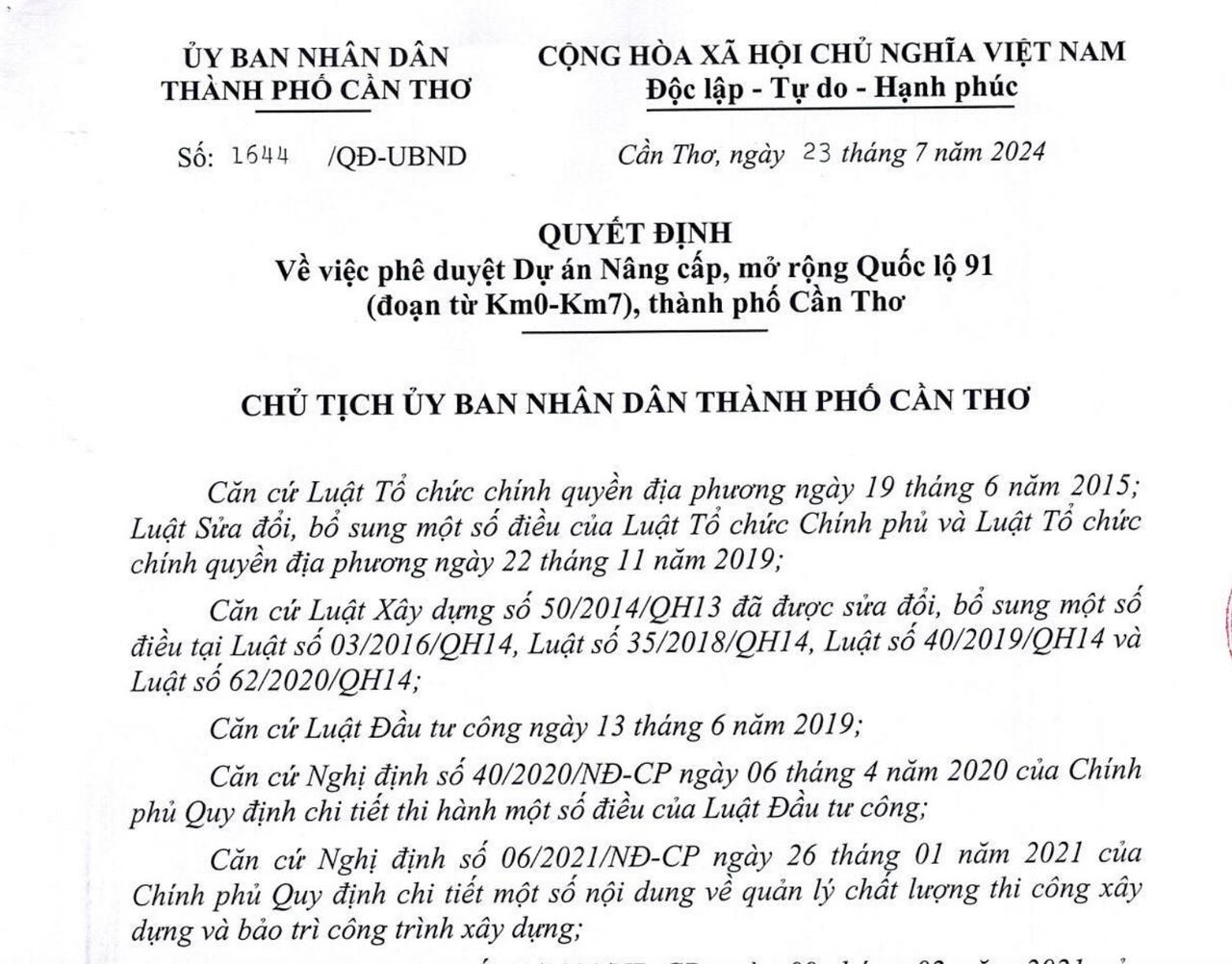 Phó chủ tịch UBND TP. Cần Thơ Dương Tấn Hiển vừa ký phê duyệt dự án nâng cấp, mở rộng Quốc lộ 91 (đoạn từ Km0 - Km7), TP. Cần Thơ.