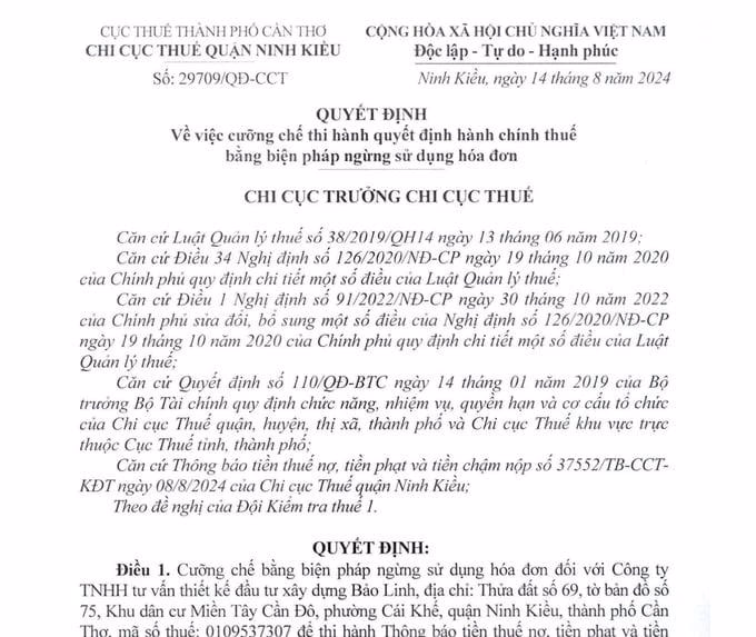Theo đó, Chi cục Thuế quận Ninh Kiều yêu cầu Công ty TNHH tư vấn thiết kế đầu tư xây dựng Bảo Linh phải nghiêm chỉnh thực hiện Quyết định này. Quyết định này có hiệu lực thi hành trong thời hạn 01 năm, kể từ ngày 14/08/2024 đến ngày 13/08/2024.