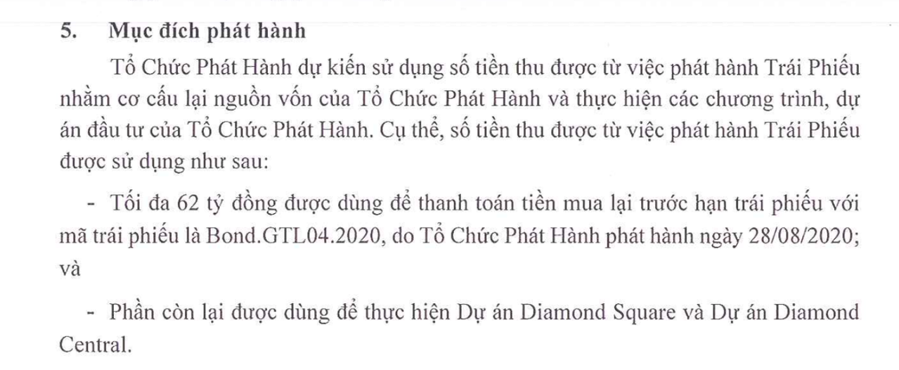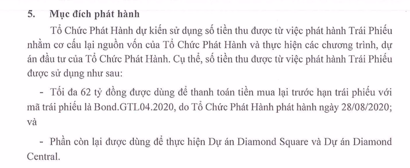 Cụ thể, doanh nghiệp đã dự chi tối đa 62 tỷ đồng nhằm mua lại trước hạn lô trái phiếu có mã Bond.GTL04.2020 được phát hành ngày 28/08/2020. Phần còn lại được dùng để thực hiện Dự án Diamond Square và Dự án Diamond Central.