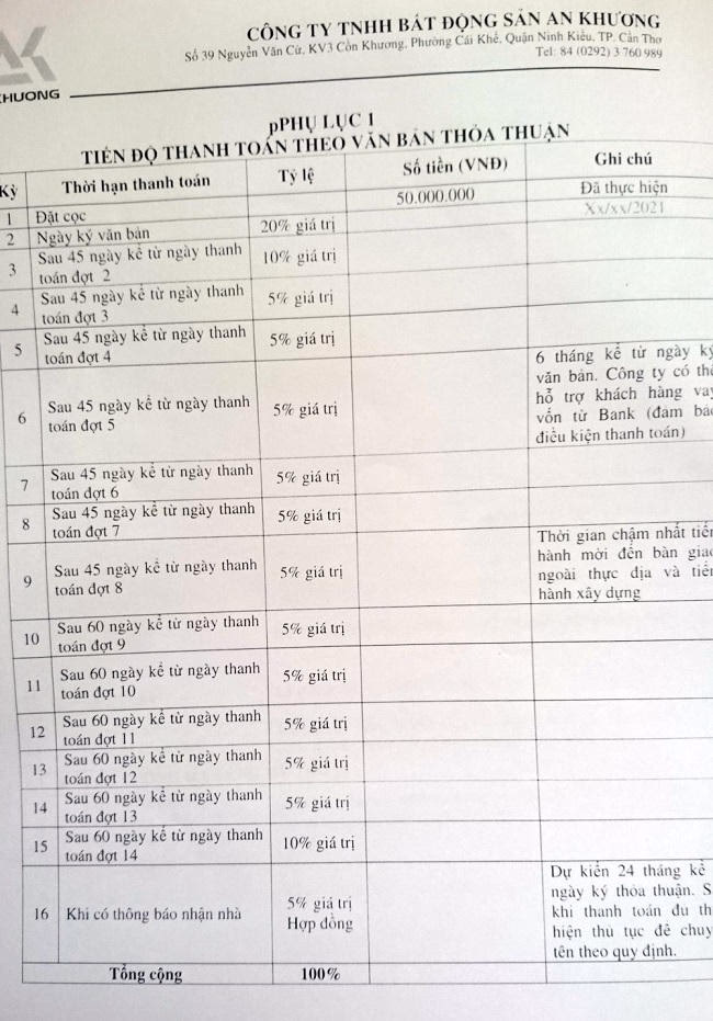 Đồng thời Công ty TNHH Bất động sản An Khương cũng đưa ra dự thảo Thỏa thuận Chính thức để cho khách hàng xem các điều khoản, sau 07 ngày đặt cọc, khách hàng đồng ý thì ký Thỏa thuận chính thức về việc chuyển nhượng quyền sử dụng đất và tài sản gắn liền với đất, thuộc Khu đô thị mới Cồn Khương.