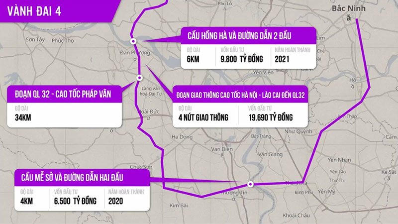 Cụ thể, TP Hà Nội đã lập đề xuất đầu tư ba dự án thành phần theo hình thức BT, gồm đoạn từ cao tốc Nội Bài - Lào Cai - quốc lộ 32 - Pháp Vân - Cầu Giẽ dài 34 km, tổng mức đầu tư 16.277 tỷ đồng của Tập đoàn T&T; đoạn Pháp Vân - Cầu Giẽ đến cao tốc Hà Nội - Hải Phòng dài 13,9 km, tổng mức đầu tư 9.800 tỷ đồng của Liên danh Phương Thành - Nguyên Minh; cầu Hồng Hà và đường dẫn dài 6 km, tổng mức đầu tư 9.876 tỷ đồng của Công ty cổ phần Tập đoàn Hoành Sơn (chưa phê duyệt đề xuất).