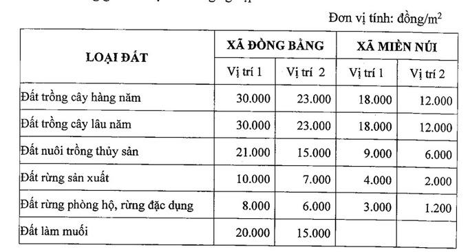 Giá đất được quy định bằng 1,6 lần giá đất trồng cây lâu năm của vị trí 1 cùng vùng đối với đất nông nghiệp nằm trong địa giới hành chính các phường, các thị trấn còn lại của tỉnh (trừ đất nuôi trồng thủy sản vị trí 2 và đất rừng sản xuất vị trí 2);