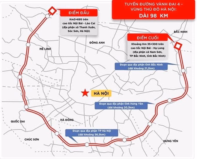 Dự án Vành đai 4 - Vùng Thủ đô có tổng chiều dài khoảng 112,8km; trong đó 58,2km đi qua địa bàn Hà Nội; đoạn qua Hưng Yên khoảng 19,3km và đoạn qua Bắc Ninh khoảng 35,3km. Điểm đầu của dự án tại nối điểm cao tốc Nội Bài - Lào Cai, điểm cuối nối cao tốc Nội Bài - Hà Long.
