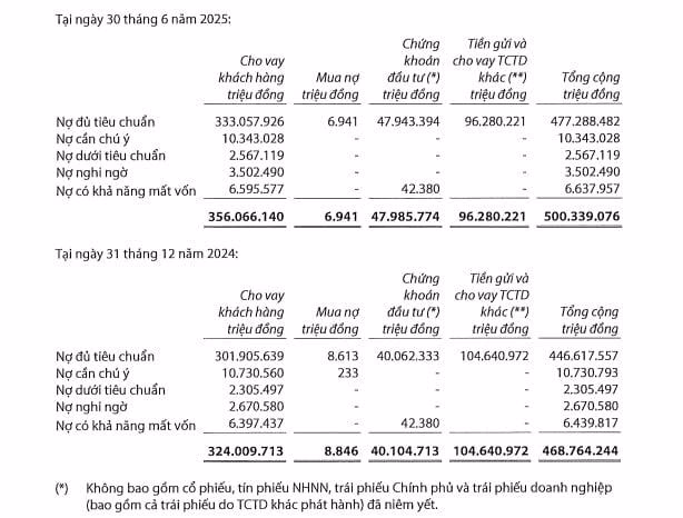 Tiền gửi khách hàng đạt 304.392 tỷ đồng, tăng 10,2%. Đáng chú ý, tỷ lệ CASA và tài khoản siêu lợi suất tăng 51% so với đầu năm, phản ánh hiệu quả trong chiến lược tối ưu dòng tiền nhàn rỗi.
