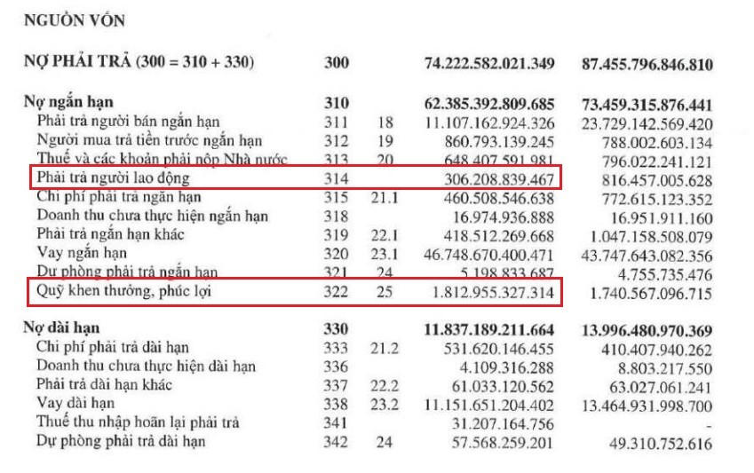 Về các khoản phải trả liên quan đến người lao động, kết thúc năm 2022 HPG ghi nhận con số này là hơn 2.200 tỷ đồng. Trong đó, tiền lương phải trả người lao động là 306,2 tỷ đồng; quỹ khen thưởng phúc lợi là 1.813 tỷ đồng và kinh phí công đoàn, bảo hiểm xã hội, bảo hiểm y tế là 82,4 tỷ đồng.