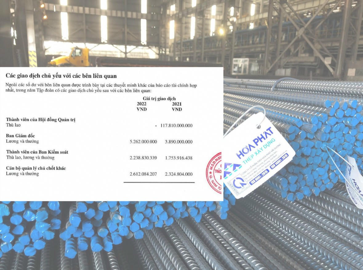 Mặc dù HĐQT không nhận thù lao năm 2022 nhưng tổng lương và thưởng cho Ban Giám đốc HPG trong năm vừa qua là 5,26 tỷ đồng (tăng 35% so với năm 2021). Được biết, Ban Giám đốc Hòa Phát hiện có 4 người, như vậy, trung bình mỗi thành viên Ban Giám đốc nhận về hơn 1,3 tỷ thu nhập cho cả năm, tương đương 110 triệu đồng/tháng.