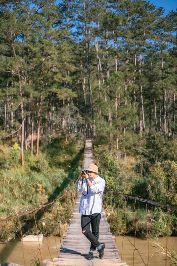 Hai bên cầu treo La Bá là rừng thông xanh mát, bạt ngàn tựa như một khung cảnh trong các câu chuyện cổ tích. Có cầu gỗ, có rừng thông, có suối chảy… các bạn trẻ đến đây như tìm đến một chốn bình yên nơi phố núi mộng mơ. Mặc dù cầu treo La Bá có hơi đáng sợ nhưng đây luôn là điểm đến được giới trẻ săn đón mỗi khi đến Đà Lạt.