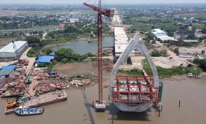Cầu vượt sông Đào - cầu Đống Cao nối từ đường Song Hào đến đường Vũ Hữu Lợi hiện đã hoàn thành 90% khối lượng và dự sẽ hợp long vào cuối tháng 8/2024.