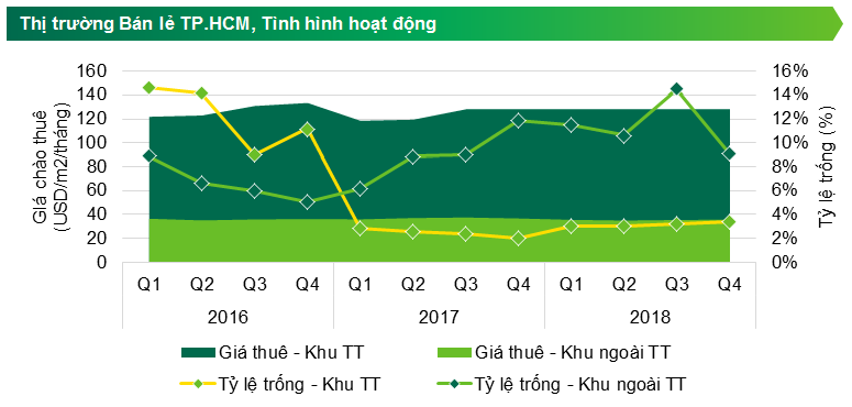 Mặt bằng bán lẻ khu trung tâm cũng có tỷ lệ trống là 3%, tăng 1 điểm phần trăm (đpt) so với cùng kỳ năm trước và không đổi so với quý liền trước. Trong khi đó, tỷ lệ trống ở vùng ven cao hơn, đạt 9%, giảm 2,8 đpt so với cùng kỳ năm trước. Nguyên nhân chính do tỷ lệ lấp đầy được cải thiện tại các dự án khu ngoài trung tâm mới mở trong năm 2018.