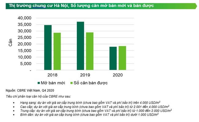 Cụ thể, tại báo cáo vừa công bố CBRE cho biết, trong năm 2020, thị trường Hà Nội ghi nhận xấp xỉ 18.000 căn hộ mở bán mới, giảm 52% theo năm. Đây là mức mở bán thấp nhất theo năm tính từ năm 2015 – thời điểm thị trường phục hồi mạnh mẽ.