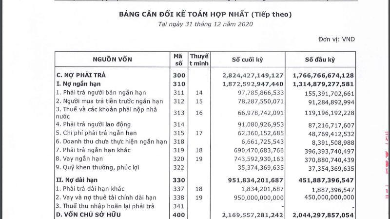 Nợ phải trả tính đến cuối quý 1 ghi nhận hơn 2.824 tỷ đồng, tăng hơn 1.000 tỷ đồng so với đầu năm. Trong đó, tổng dư nợ đi vay ghi nhận hơn 1.693 tỷ đồng.
