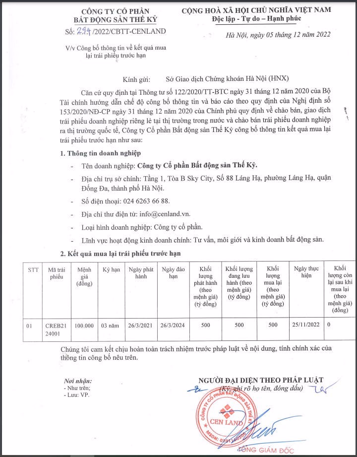 CTCP Bất động sản Thế Kỷ (CenLand, mã CK: CRE) vừa công bố thông tin về kết quả mua lại trước hạn toàn bộ lô trái phiếu trị giá 500 tỷ đồng vào ngày 25/11.