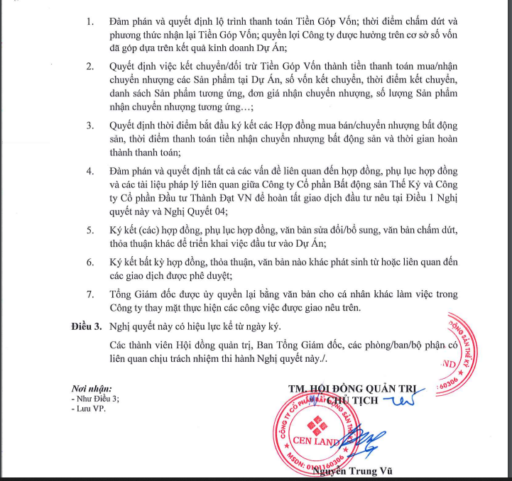 Thời điểm hoàn thành thanh toán tiền nhận chuyển nhượng bất động sản (dự kiến) không muộn hơn quý II/2023. HĐQT Cenland giao/ủy quyền cho Tổng Giám đốc đồng thời là người đại diện theo pháp luật của công ty chủ động xem xét, quyết định triển khai các công việc liên quan đến dự án.