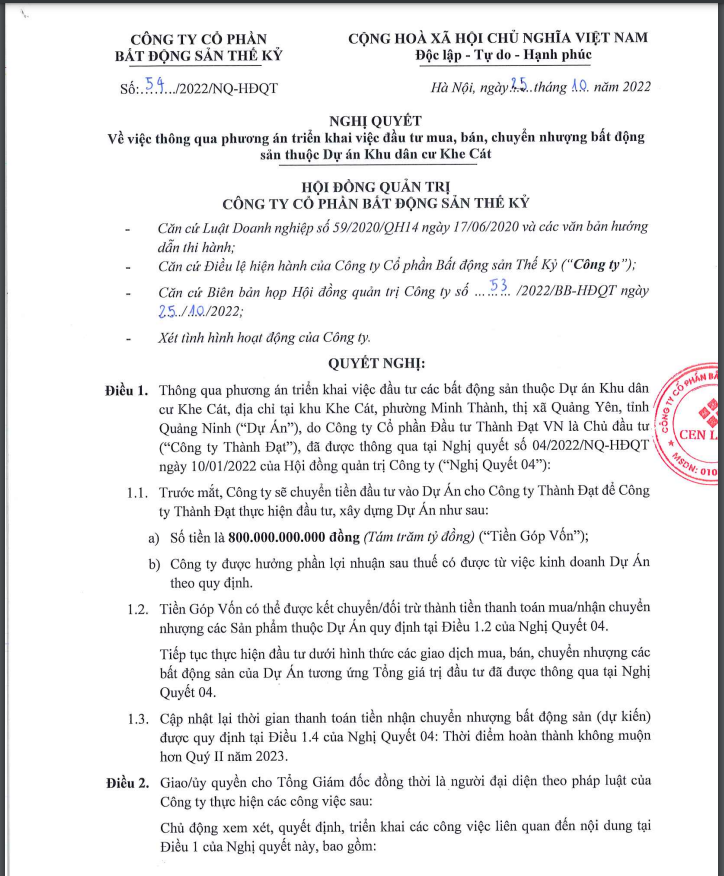 Hội đồng quản trị (HĐQT) CTCP Bất động sản Thế Kỷ (Cenland, Mã CK: CRE) vừa thông qua phương án triển khai việc đầu tư các bất động sản thuộc Dự án Khu dân cư Khe Cát tại thị xã Quảng Yên, Quảng Ninh do CTCP Đầu tư Thành Đạt VN làm chủ đầu tư.