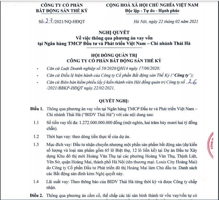 Hội đồng quản trị CTCP Bất động sản Thế Kỷ (CenLand, mã: CRE) vừa ban hành Nghị quyết về việc thông qua phương án vay vốn tại ngân hàng BIDV chi nhánh Thái Hà với số tiền vay tối đa 1.272 tỷ đồng.