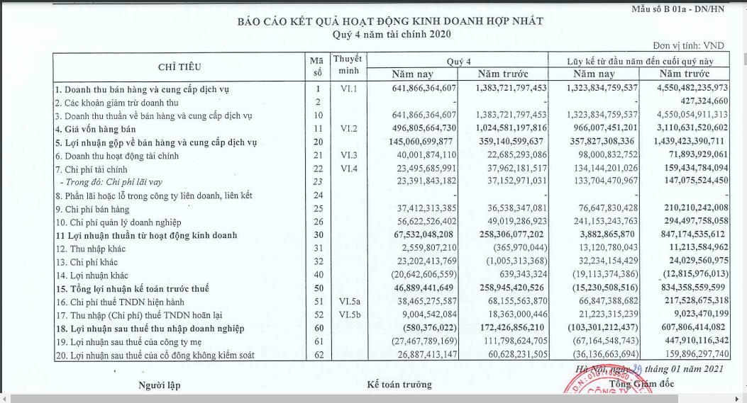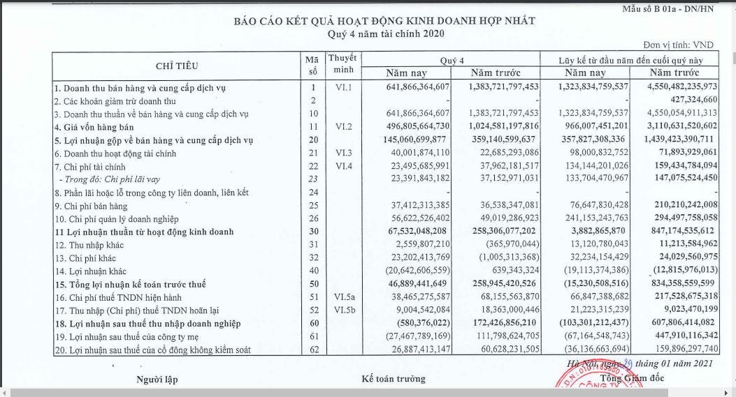 Lũy kế cả năm, doanh thu thuần của doanh nghiệp đạt 1.965 tỷ đồng, lãi sau thuế đạt 23 tỷ đồng, lần lượt giảm 50% và 87% so với năm 2019.