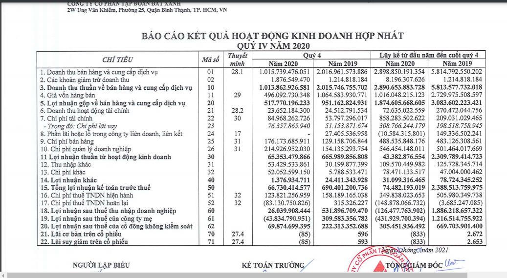 Lũy kế năm 2020, Đất Xanh đạt doanh thu thuần 2.890 tỷ đồng, giảm 50% so với năm 2019. Công ty lỗ sau thuế 126 tỷ đồng và lỗ ròng 432 tỷ đồng trong khi năm trước hai chỉ tiêu lợi nhuận này lần lượt là lãi 1.886 tỷ đồng và 1.216 tỷ đồng.