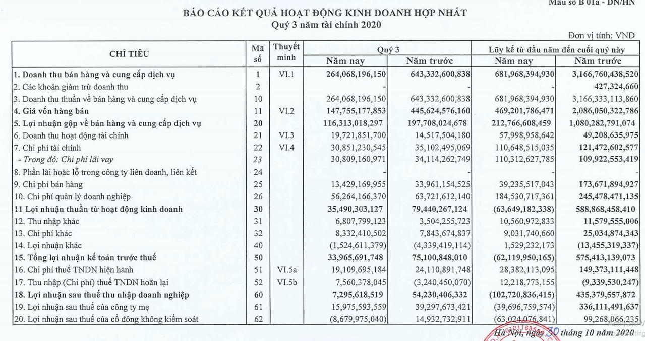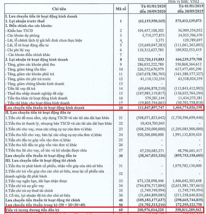 Đáng chú ý, tại ngày 30/9/2020, tổng tài sản giảm 6% so với thời điểm đầu năm, ghi nhận gần 7.543 tỷ đồng. Trong đó, tiền và các khoản tương đương tiền giảm 16% so với hồi đầu năm, ghi nhận gần 170 tỷ đồng, chỉ chiếm 2,3% tổng tài sản. Khoản phải thu ngắn hạn cũng tăng lên 1.057 tỷ đồng.