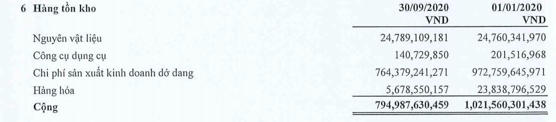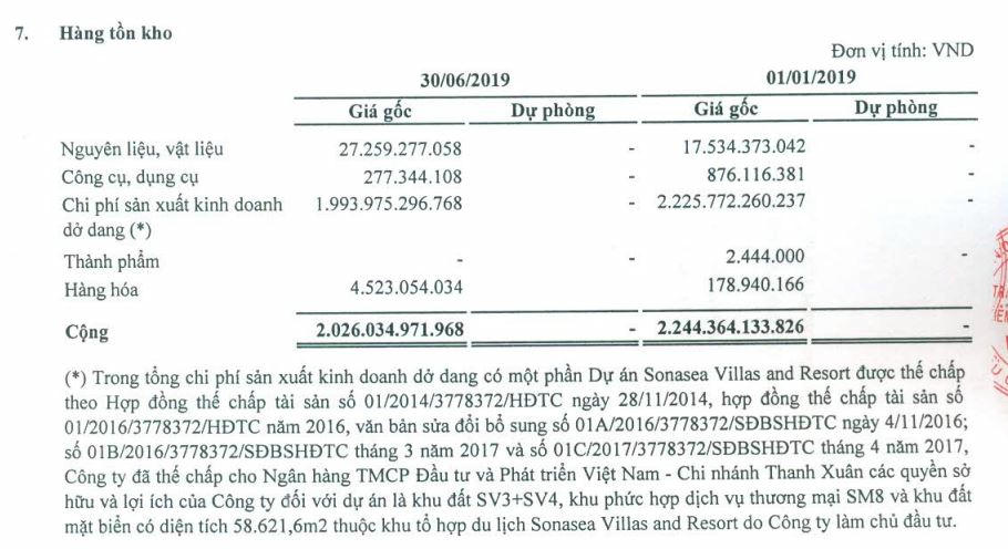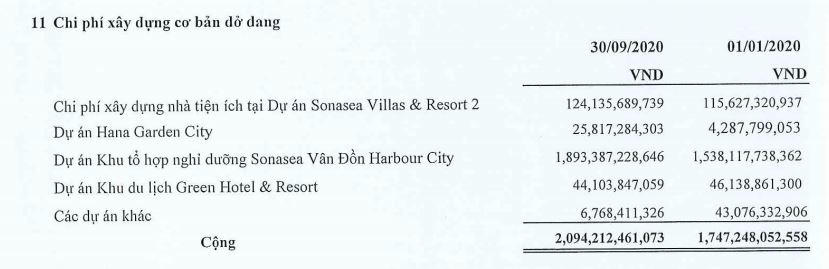 Theo báo cáo tài chính quý 3/2020, tính đến 30/9/2020, hàng tồn kho ở mức gần 795 tỷ đồng. Các công trình xây dựng cơ bản dở dang đang có số dư lớn nhất chính là dự án Sonasea Vân Đồn Harbor City (hơn 1.893 tỷ đồng), tiếp theo là chi phí xây dựng nhà tiện ích tại dự án Sonasea Villas& Resort 2 ( hơn 124 tỷ đồng). Kết thúc 9 tháng qua, chi phí xây dựng cơ bản dở dang tăng 20% so với hồi đầu năm, ghi nhận 2.094 tỷ đồng.