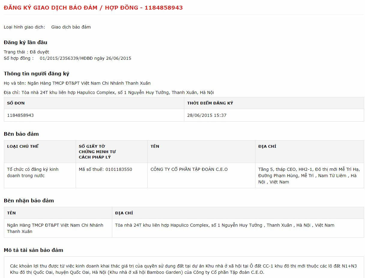 Ngoài dự án Sonasea Vân Đồn Harbor City bị CEO Group thế chấp tại BIDV – chi nhánh Thanh Xuân thì năm 2015, CEO Group cũng từng thế chấp dự án Khu nhà ở xã hội Bamboo Garden.