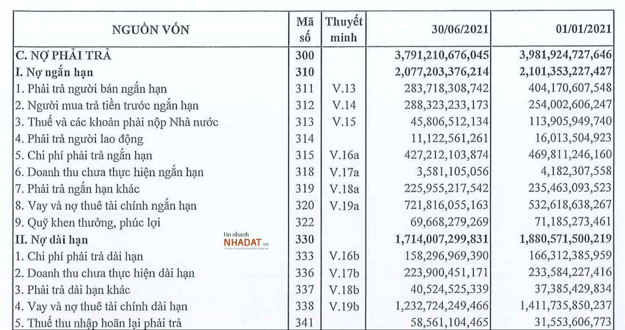 Tổng nợ phải trả của doanh nghiệp tính đến hết quý 2/2021 ở mức 3.791 tỷ đồng, giảm nhẹ so với đầu kỳ. Trong đó, tổng dư nợ đi vay chiếm 51%, ghi nhận hơn 1.954 tỷ đồng.