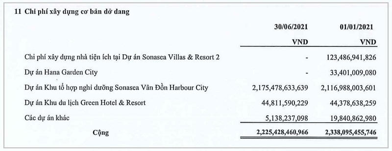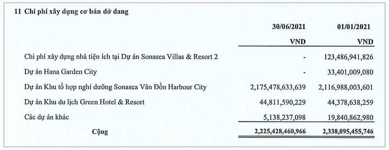 Ngoài ra, doanh nghiệp còn hơn 2.186 tỷ đồng chi phí xây dựng cơ bản dở dang tại các dự án như: Khu tổ hợp nghỉ dưỡng Sonasea Vân Đồn Harbour City (hơn 2.137 tỷ đồng), Khu du lịch Green Hotel & Resort (gần 45 đồng). Doanh nghiệp không còn ghi nhận chi phí xây dựng dở dang tại dự án Sonasea Villas & Resort 2 và Hana Garden City.