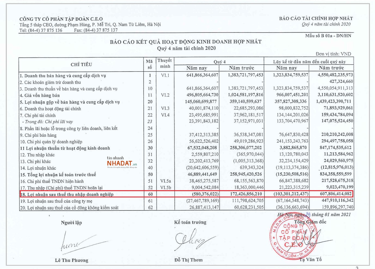 Sang quý 4/2020, CEO Group cũng không khá khẩm hơn. Cụ thể, tính riêng quý 4 doanh thu thuần đạt 642 tỷ đồng, giảm hơn nửa so với doanh thu 1.384 tỷ đồng đạt được quý 4/2019. Do lợi nhuận gộp về bán hàng và cung cấp dịch vụ đạt 145 tỷ đồng, giảm hơn 200 tỷ đồng so với cùng kỳ năm 2019 nên lợi nhuận sau thuế thu nhập doanh nghiệp âm 580 triệu, so với con số dương 172 tỷ đồng của cùng kỳ năm 2019.