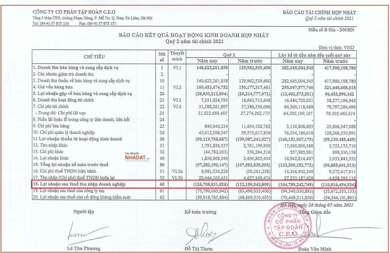 Kết quả, kết thúc quý II, CEO lỗ gần 127 tỷ đồng, nhiều hơn không đáng kể so với mức lỗ cùng kỳ năm trước. Đây là quý thứ ba liên tiếp doanh nghiệp này báo lỗ. Lũy kế 6 tháng đầu năm, doanh nghiệp tiếp tục báo lỗ gần 165 tỷ đồng (cùng kỳ lỗ 110 tỷ đồng). Năm nay, CEO Group đặt kế hoạch doanh thu hợp nhất 1.600 tỷ đồng và LNST 80 tỷ đồng. Hết nửa năm, công ty mới hoàn thành hơn 17% mục tiêu doanh thu và còn cách rất xa mục tiêu lợi nhuận.