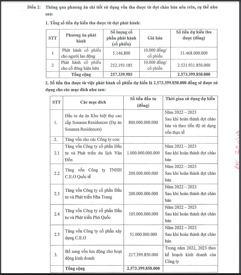 Cả hai phương án chào bán đều ở mức giá 10.000 đồng/ cổ phiếu. Theo đó, CEO dự kiến thu về gần 2.522 tỷ đồng từ phát hành cổ phiếu cho cổ đông hiện hữu và hơn 51 tỷ đồng từ phát hành cổ phiếu ESOP. Tổng số tiền thu về từ 2 đợt chào bán sẽ là hơn 2.573 tỷ đồng. Nếu các đợt phát hành này diễn ra thành công, vốn điều lệ của CEO Group sẽ tăng lên gần 5.147 tỷ đồng.
