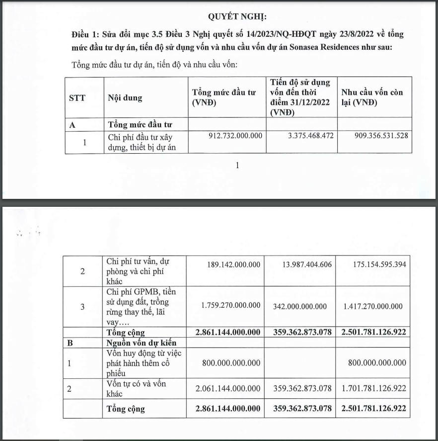 Trong đó, liên quan đến dự án Sonasea Residences tại Phú Quốc, khu biệt thự này có diện tích 62,51 ha, quy mô đầu tư gồm biệt thự, liền kề, nhà phố thương mại, nhà ở chung cư và các công trình công cộng dịch vụ khác. Tổng vốn đầu tư ban đầu gần 1.693 tỷ đồng, trong đó vốn huy động từ phát hành thêm cổ phiếu 800 tỷ đồng và phần còn lại 893 tỷ đồng vốn tự có hoặc vốn khác.