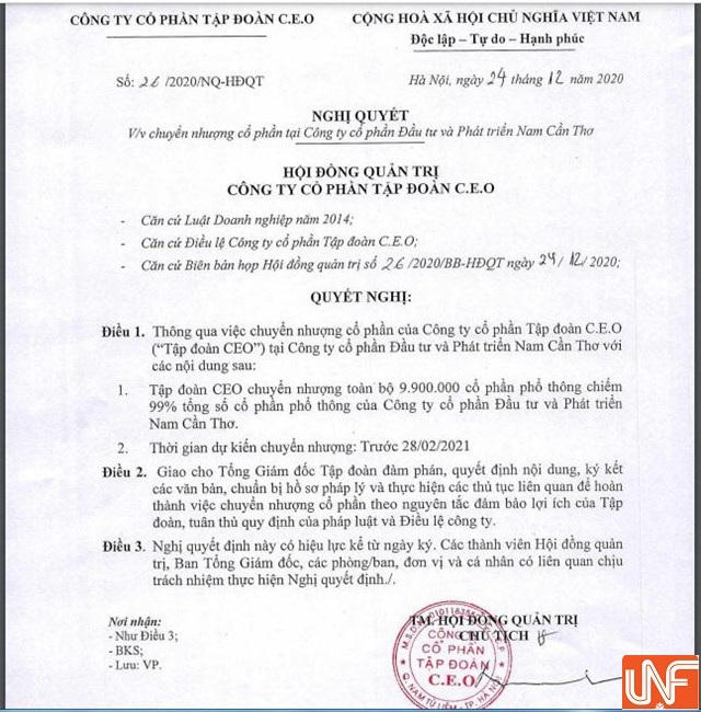 Ngày 24/12, HĐQT của Công ty Cổ phần Tập đoàn C.E.O (CEO Group, Mã: CEO) vừa có nghị quyết thông qua việc chuyển nhượng cổ phần tại Công ty cổ phần Đầu tư và Phát triển Nam Cần Thơ.
