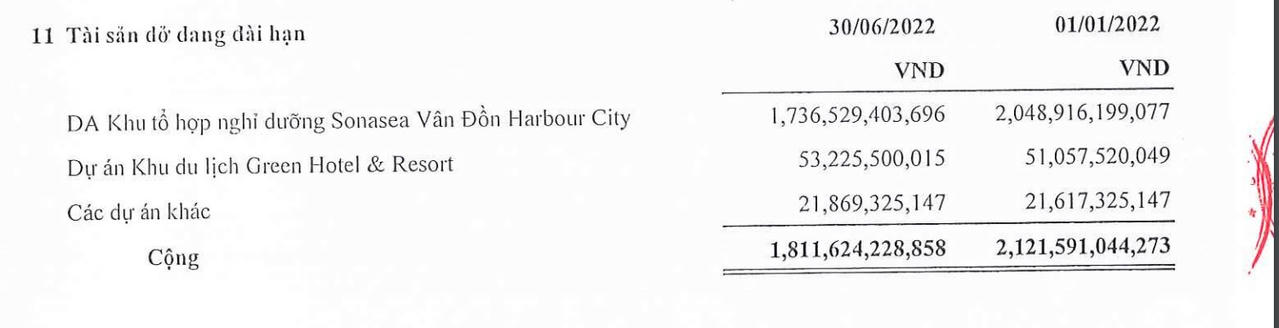 Ngoài ra, doanh nghiệp còn gần 1.812 tỷ đồng chi phí xây dựng cơ bản dở dang (giảm 15% so với đầu năm), tập trung tại Khu tổ hợp nghỉ dưỡng Sonasea Vân Đồn Harbour City (hơn 1.736 tỷ đồng), Khu du lịch Green Hotel & Resort (hơn 53 tỷ đồng)...