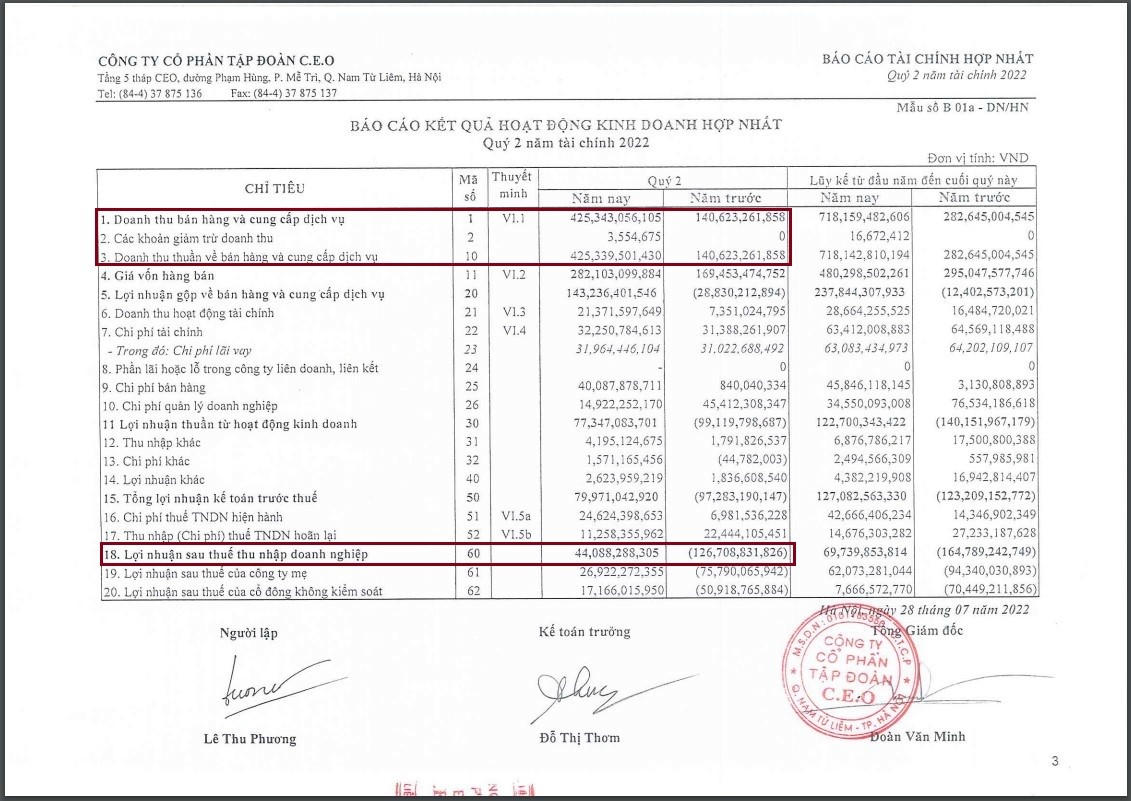 Theo báo cáo tài chính Hợp nhất quý II/2022 của CEO Group, doanh nghiệp ghi nhận doanh thu thuần hơn 425 tỷ đồng (cao gấp 2 lần cùng kỳ). Trong đó, doanh thu kinh doanh bất động sản tăng 2,4 lần lên hơn 295 tỷ đồng, doanh thu cung cấp dịch vụ tăng 6 lần lên gần 130 tỷ đồng. Doanh thu từ hoạt động tài chính cũng tăng gấp 2 lần lên 21 tỷ đồng.
