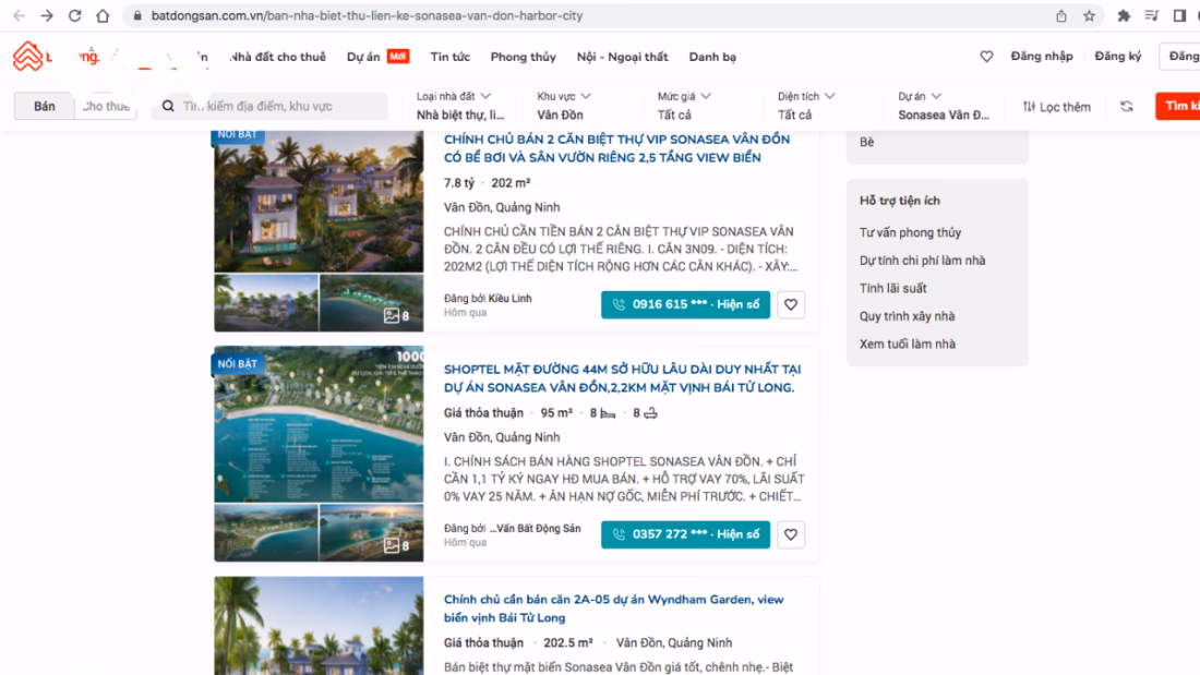 Các căn biệt thự được rao bán trên các web bất động sản, trong khi ngày 6/1/2022, Tập đoàn C.E.O mới tổ chức lễ động thổ phân khu biệt thự biển Wyndham Garden Sonasea Vân Đồn, thuộc dự án Sonasea Vân Đồn Harbor City (Khu kinh tế Vân Đồn, Quảng Ninh).
