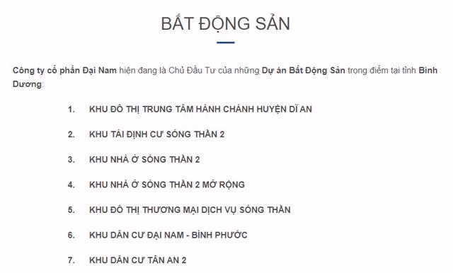Theo thông tin trên website của doanh nghiệp, Đại Nam là chủ đầu tư của loạt dự án ở Bình Dương: Khu đô thị Trung tâm hành chính huyện Dĩ An (66 ha), khu nhà ở Sóng Thần 2 (4,3 ha), khu tái định cư Sóng Thần 2, khu đô thị thương mại dịch vụ Sóng Thần (6,4 ha), khu dân cư Tân An 2, khu dân cư Đại Nam,…