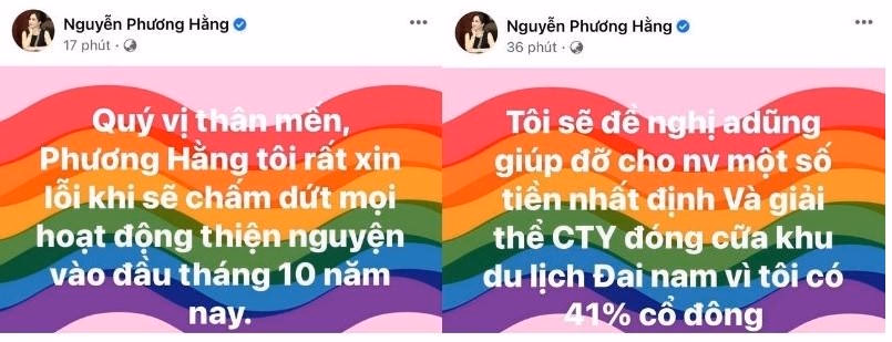 Mới đây, trang Facebook cá nhân của bà Nguyễn Phương Hằng – CEO Công ty CP Đại Nam đã tái khẳng định sẽ chấm dứt mọi hoạt động thiện nguyện, khả năng giải thể công ty và đóng cửa khu du lịch Đại Nam vì đang sở hữu 41% cổ phần.