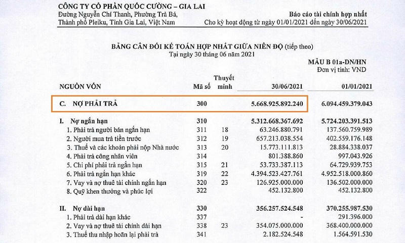 Theo bảng cân đối kế toán tại thời điểm ngày 30/6, khoản phải trả cho Công ty Cổ phần Đầu tư Sunny Island lên tới gần 2.900 tỷ đồng. Được biết, đây là khoản tiền Quốc Cường Gia Lai nhận từ đối tác từ nhiều năm trước nhưng chưa thể triển khai dự án Khu dân cư Bắc Phước Kiển (huyện Nhà Bè, TP Hồ Chí Minh) do hàng loạt các thủ tục pháp lý thay đổi.