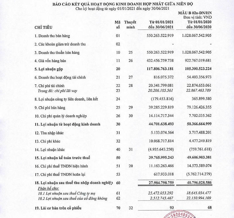 Theo Báo cáo tài chính bán niên soát sét của Quốc Cường Gia Lai, 6 tháng đầu năm, Quốc Cường Gia Lai đạt doanh thu thuần 550 tỷ đồng, giảm gần phân nửa so với cùng kỳ 2020. Lợi nhuận sau thuế đạt 28 tỷ đồng, giảm hơn 30%.