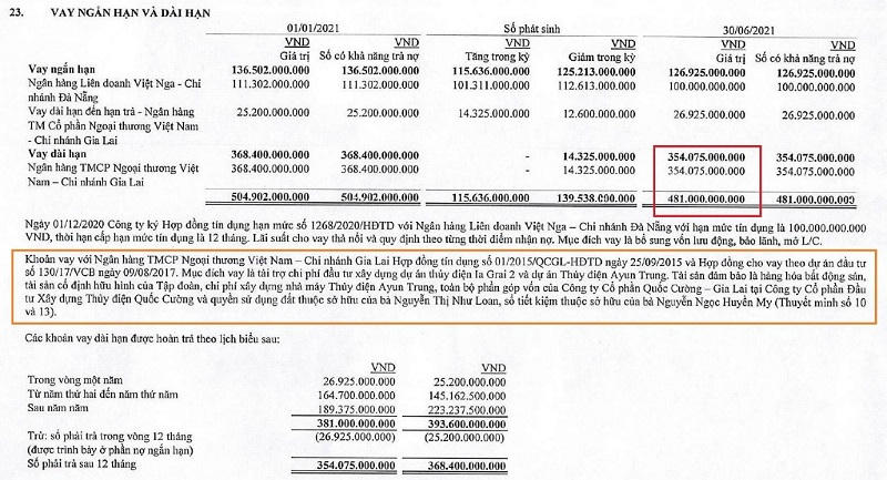 Trong đó, khoản vay lớn nhất của Quốc Cường Gia Lai hiện có tổng dư nợ hơn 354 tỷ đồng. Đây là các khoản vay dài hạn theo 2 hợp đồng năm 2015, 2017 tại Vietcombank chi nhánh Gia Lai để tài trợ chi phí cho việc đầu tư xây dựng 2 dự án thủy điện Ia Grai 2, Ayun Trung.