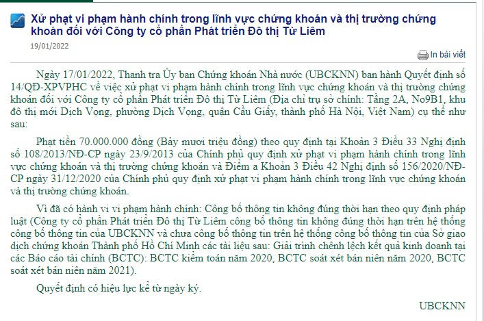 Lý do: Công bố thông tin không đúng thời hạn theo quy định pháp luật (Công ty cổ phần Phát triển Đô thị Từ Liêm công bố thông tin không đúng thời hạn trên hệ thống công bố thông tin của UBCKNN và chưa công bố thông tin trên hệ thống công bố thông tin của Sở giao dịch chứng khoán Thành phố Hồ Chí Minh các tài liệu sau: Giải trình chênh lệch kết quả kinh doanh tại các Báo cáo tài chính (BCTC): BCTC kiểm toán năm 2020, BCTC soát xét bán niên năm 2020, BCTC soát xét bán niên năm 2021).
