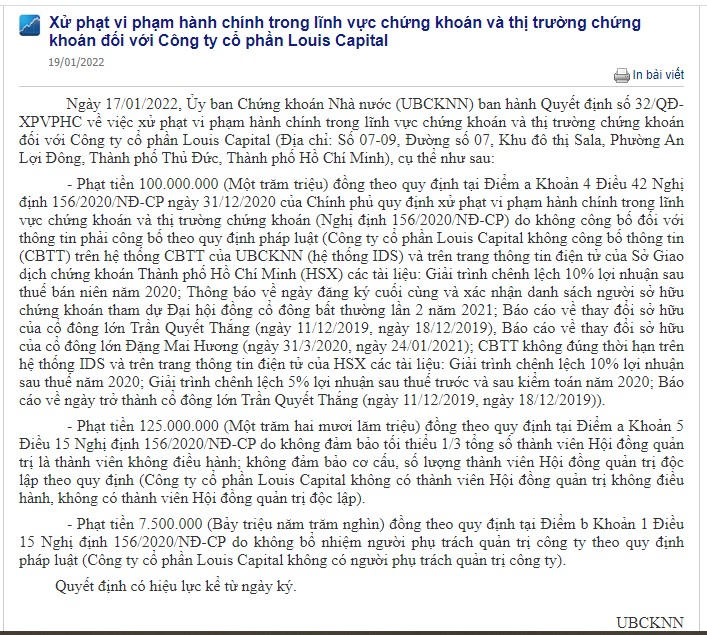 Trong đó, phạt tiền 100 triệu đồng do không công bố đối với thông tin phải công bố theo quy định pháp luật (Công ty cổ phần Louis Capital không công bố thông tin (CBTT) trên hệ thống CBTT của UBCKNN (hệ thống IDS) và trên trang thông tin điện tử của Sở Giao dịch chứng khoán Thành phố Hồ Chí Minh (HSX).