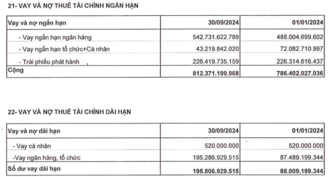 Trong đó, đối với vay và nợ thuê tài chính ngắn hạn của công ty bao gồm: vay ngắn hạn ngân hàng (hơn 542,7 tỷ đồng); vay ngắn hạn tổ chức + cá nhân (hơn 43,2 tỷ đồng) và trái phiếu phát hành (hơn 226,4 tỷ đồng).