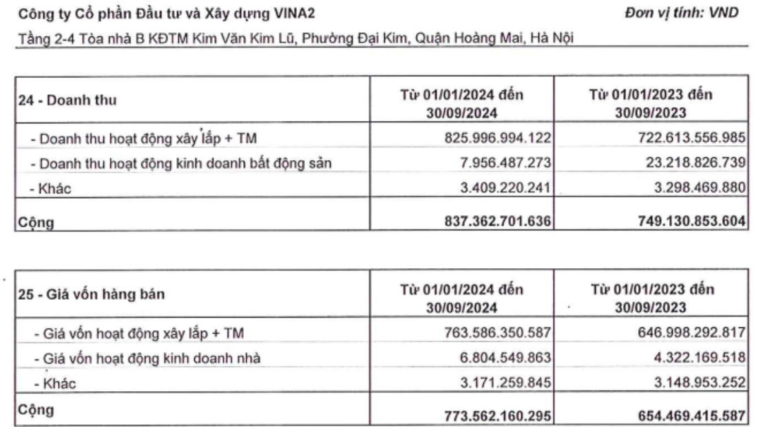 Luỹ kế từ đầu năm 2024 đến ngày 30/9/2024, doanh thu của công ty đạt hơn 837,3 tỷ đồng, bao gồm: doanh thu hoạt động xây lắp, thương mại đạt hơn 825,9 tỷ đồng, doanh thu hoạt động kinh doanh BĐS đạt hơn 7,9 tỷ đồng và doanh thu khác hơn 3,4 tỷ đồng.