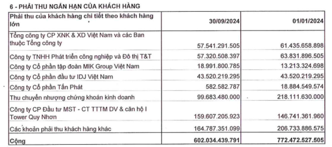 Trong đó có các khoản phải thu ngắn hạn của khách hàng gồm: Tổng Công ty cổ phần XNK&XD Việt Nam và các Ban thuộc Tổng công ty (hơn 57,5 tỷ đồng); Công ty TNHH phát triển công nghệ và đô thị T&T (hơn 57,3 tỷ đồng); CTCP Tập đoàn MIK Group Việt Nam (hơn 18,9 tỷ đồng); CTCP Đầu tư IDJ Việt Nam (hơn 43,5 tỷ đồng),…