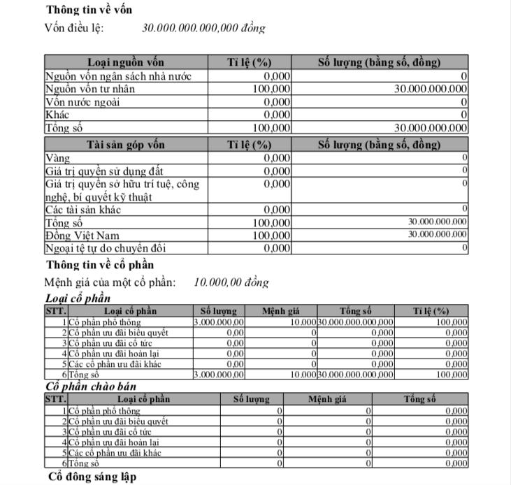 Vốn điều lệ của công ty là 6 tỷ đồng. Cổ đông sáng lập có 3 người, gồm: Nguyễn Thị Thuý góp 3,06 tỷ đồng (chiếm tỷ lệ 51% vốn điều lệ); trong khi đó, hai cổ đông Nguyễn Đình Chiến và Tạ Thị Diễm không được đề cập về vốn góp.
