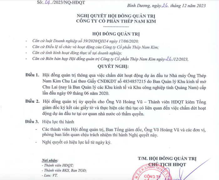 Theo nghị quyết hội đồng quản trị, Thép Nam Kim thông qua việc chấm dứt hoạt động dự án đầu tư Nhà máy ống thép Nam Kim Chu Lai do Ban Quản lý Khu kinh tế mở Chu Lai cấp phép lần đầu ngày 9/6/2020.