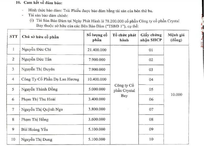 Đáng chú ý, tài sản bảo đảm cho lô trái phiếu là 78,2 triệu cổ phần, tương đương 68% vốn điều lệ Crystal Bay, thuộc sở hữu của 10 cổ đông cá nhân và 1 tổ chức trong nước. Nổi bật trong số đó là 21,4 triệu cổ phần của ông Nguyễn Đức Chi – Chủ tịch HĐQT Crystal Bay; 7,9 triệu cổ phần của ông Nguyễn Đức Tuấn – em trai ông Chi; và 10,4 triệu cổ phần của CTCP Dạ Lan Hương.